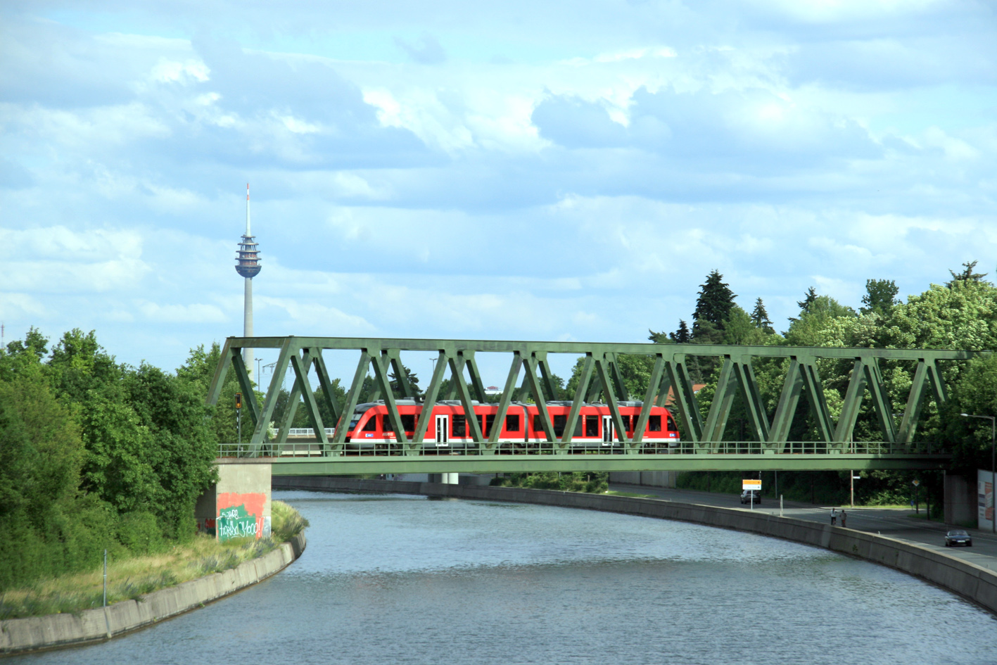 Der Main-Donau-Kanal - Blick Richtung Osten, im Hintergrund die Brücke der Rangaubahn und der ... Der Main-Donau-Kanal - Blick Richtung Osten, im Hintergrund die Brücke der Rangaubahn und der Fernsehturm in Nürnberg