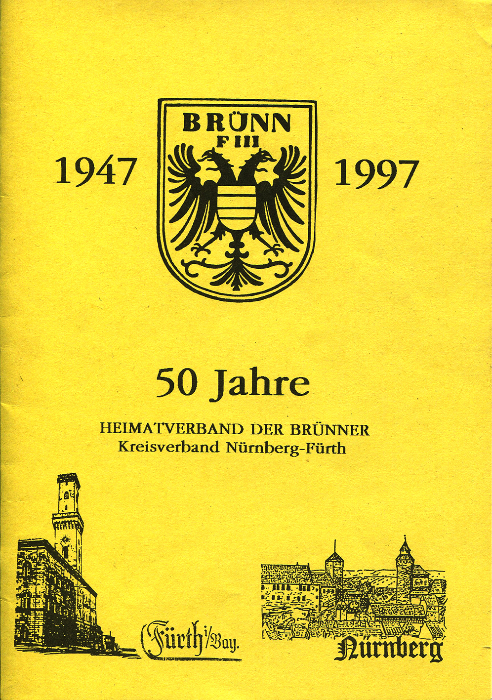 | Beschreibung | Titelblatt der Broschüre: 50 Jahre Heimatverband der Brünner, Kreisverband Fürth-Nürnberg, 1997 | ||