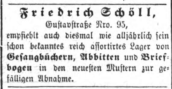| Datei:5d Anzeige Friedrich Schöll Gustavstr. 95, Ftgbl 14.03.1858.jpg | |||