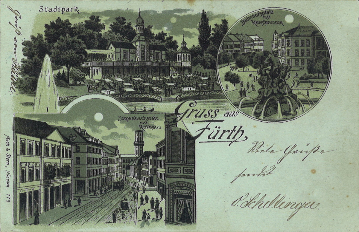 BeschreibungCentaurenbrunnen, Stadtpark-Restaurant und Schwabacher Str. Postkarte gelaufen mit Privatpost um 1898