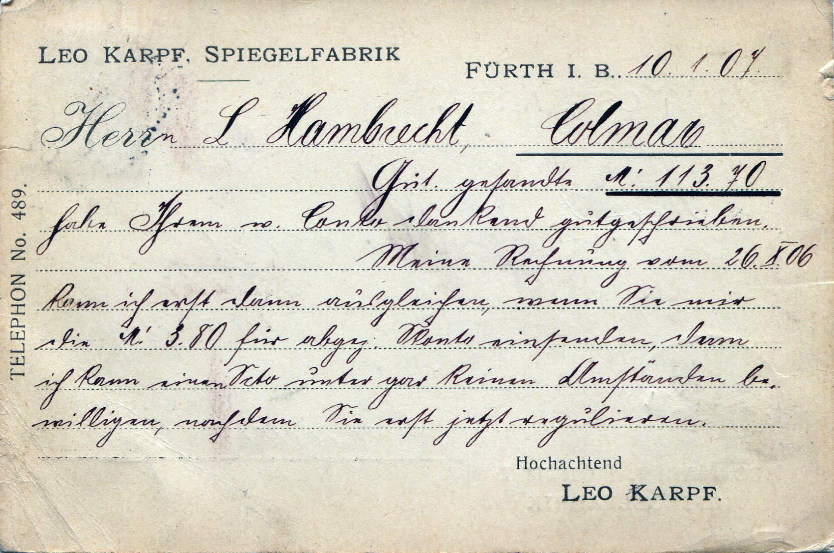 | Beschreibung | Geschäftskorrespondenz des jüdischen Geschäftsmanns Leo Karpf (Holz- und Spiegelfabrikant) nach Köln, gel. 1907 | ||