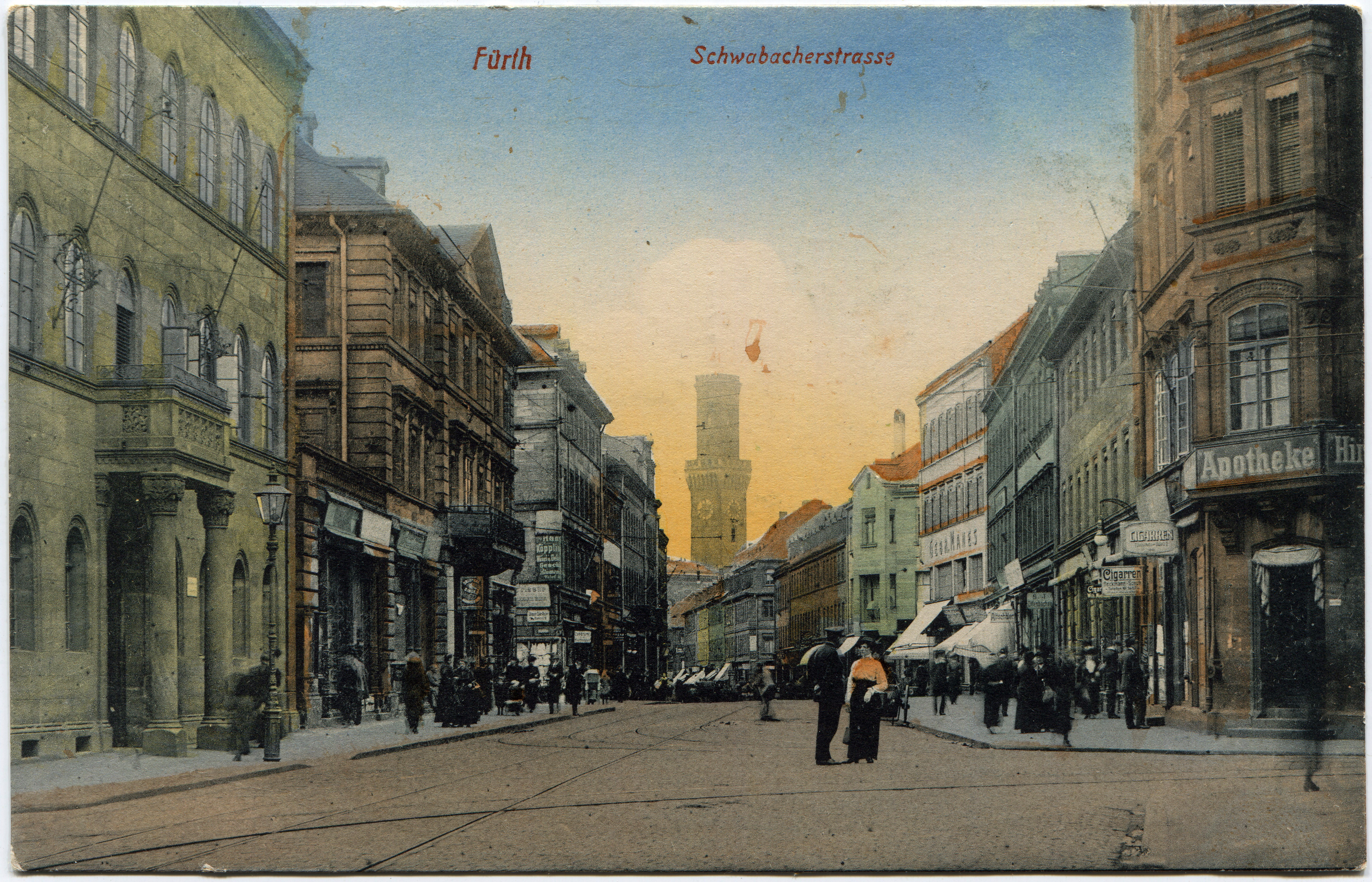 | Beschreibung | Kolorierte Ansichtskarte Blick in die Schwabacher Straße Richtung Rathaus, gel. 1917 | ||