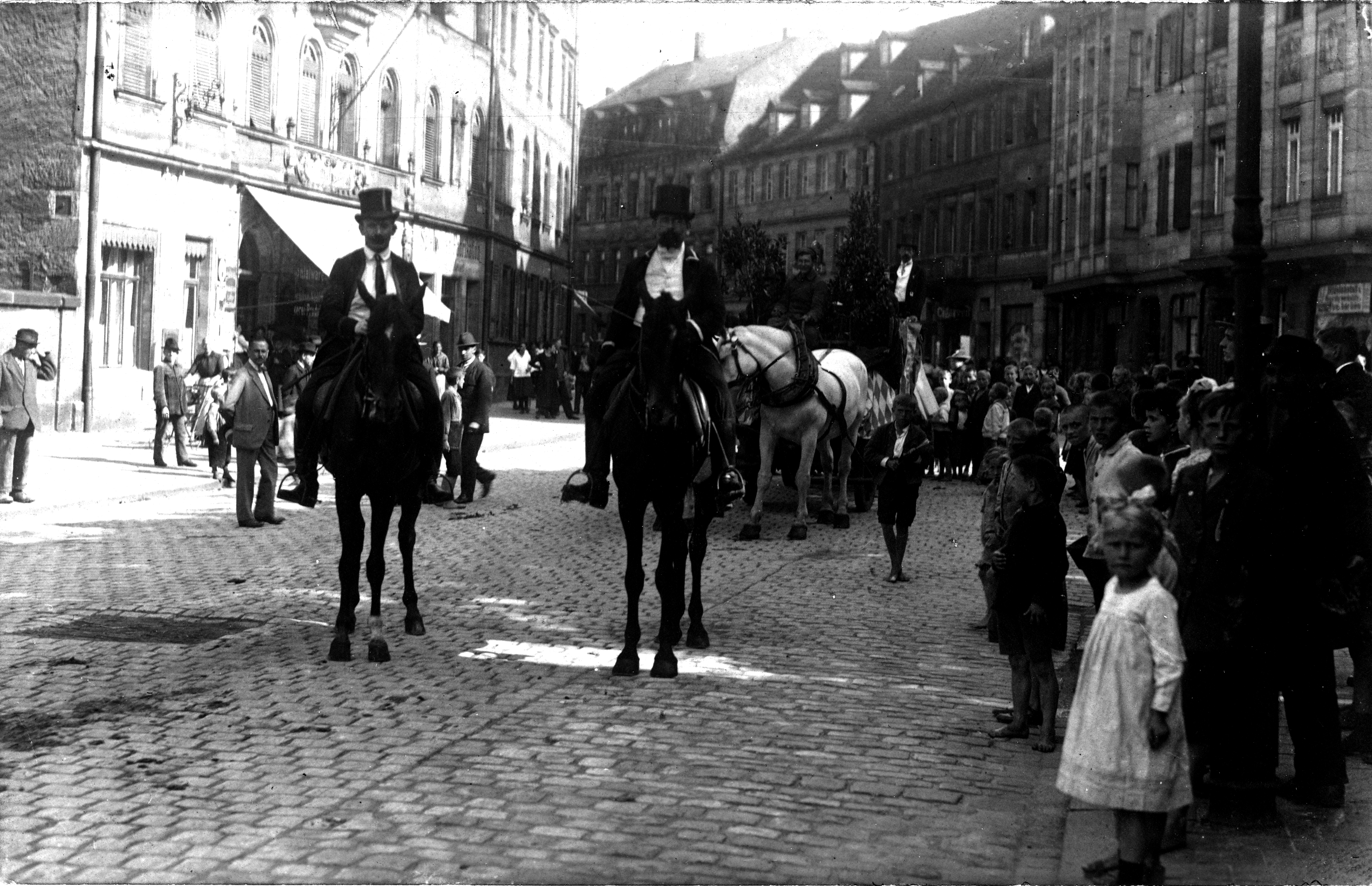 BeschreibungAnsichtskarte mit Blick in die Nürnberger Straße, vermutlich vom Erntedankumzug zur Michaeliskirchweih, ca. 1920