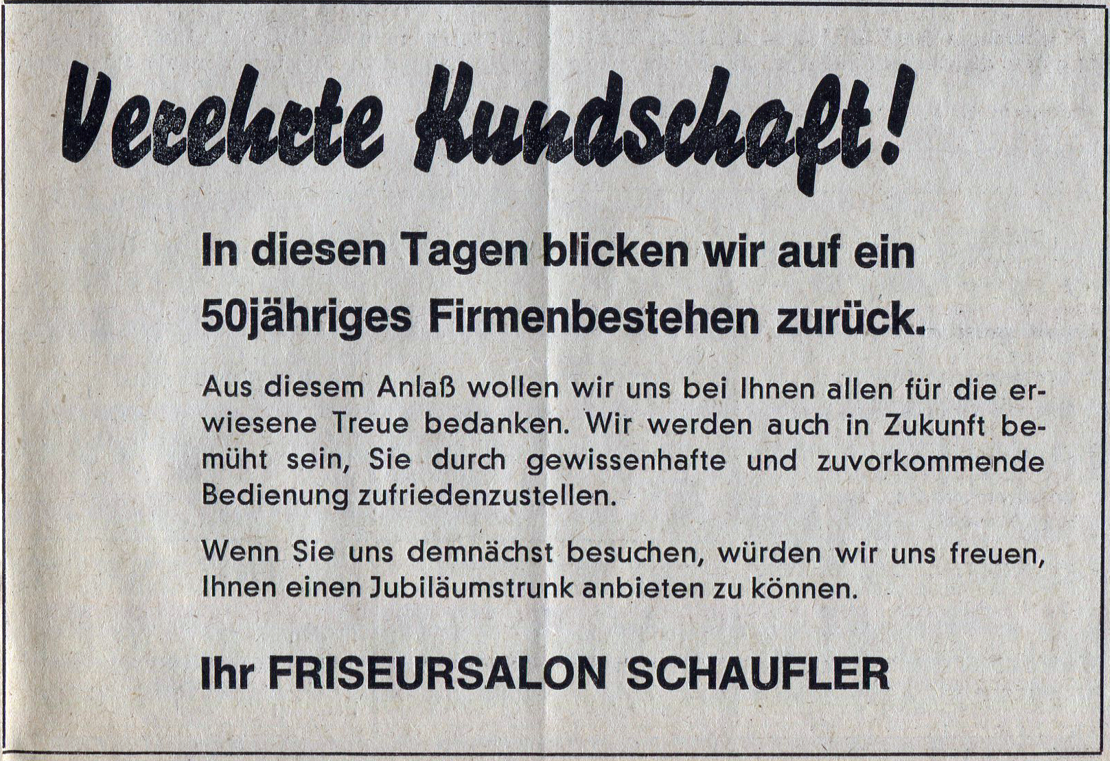 BeschreibungAnzeige zum 50jährigen Firmenbestehen des Salon Schaufler, 1979