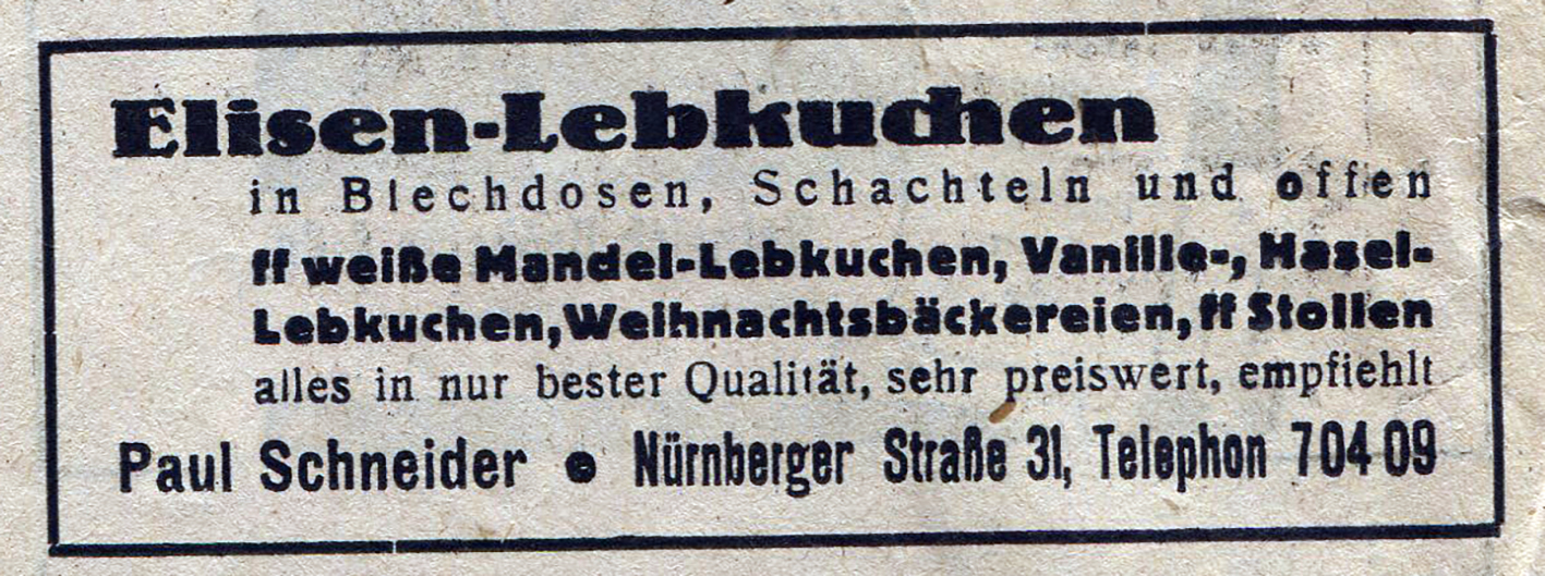 BeschreibungWerbeanzeige für Lebkuchen der Fa. Paul Schneider in der Nürnberger Straße 31, 1937
