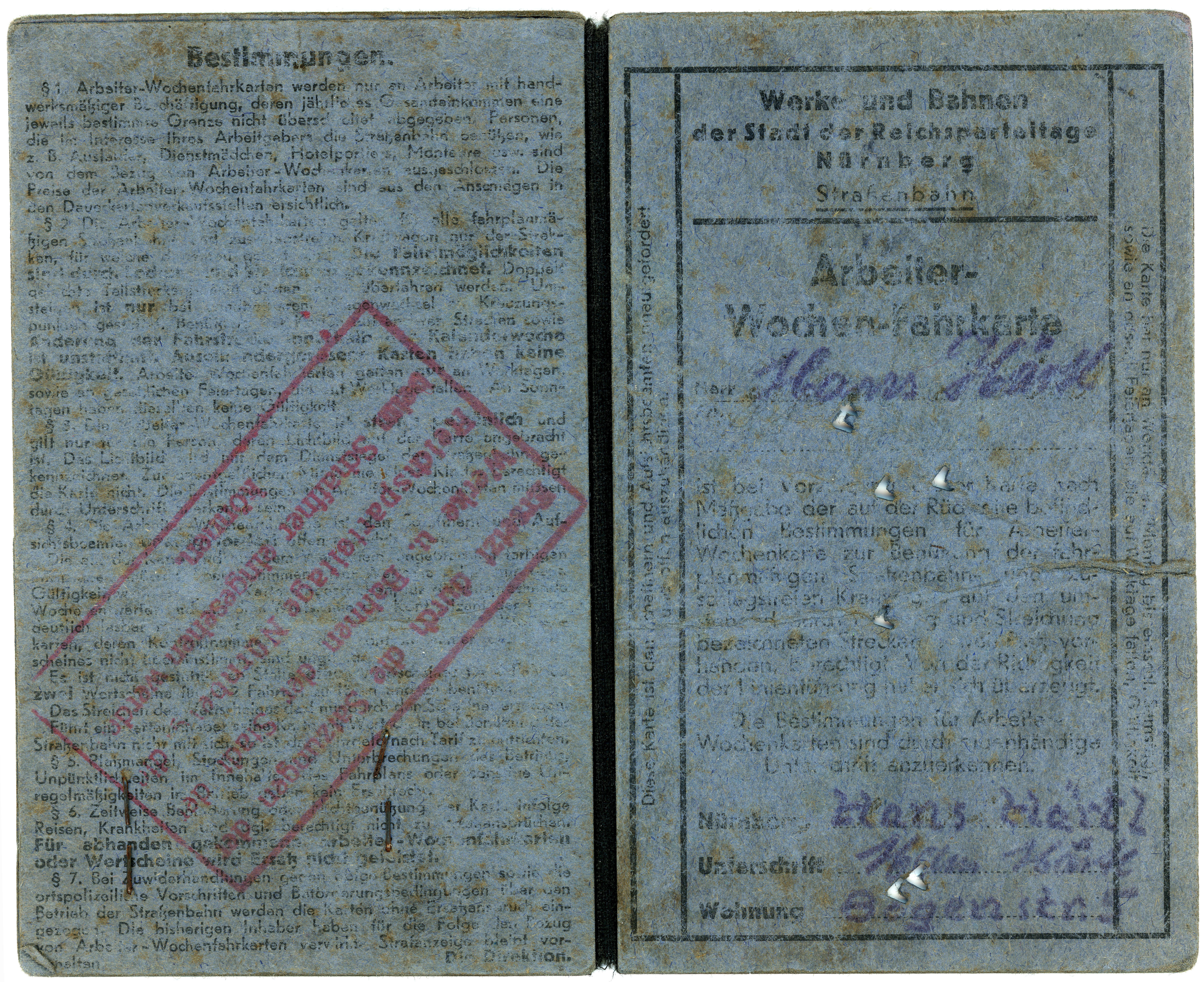 | Beschreibung | Arbeiter-Wochen-Fahrkarte für die Straßenbahn Fürth-Nürnberg in der Stadt der Reichsparteitage, ca. 1935 | ||