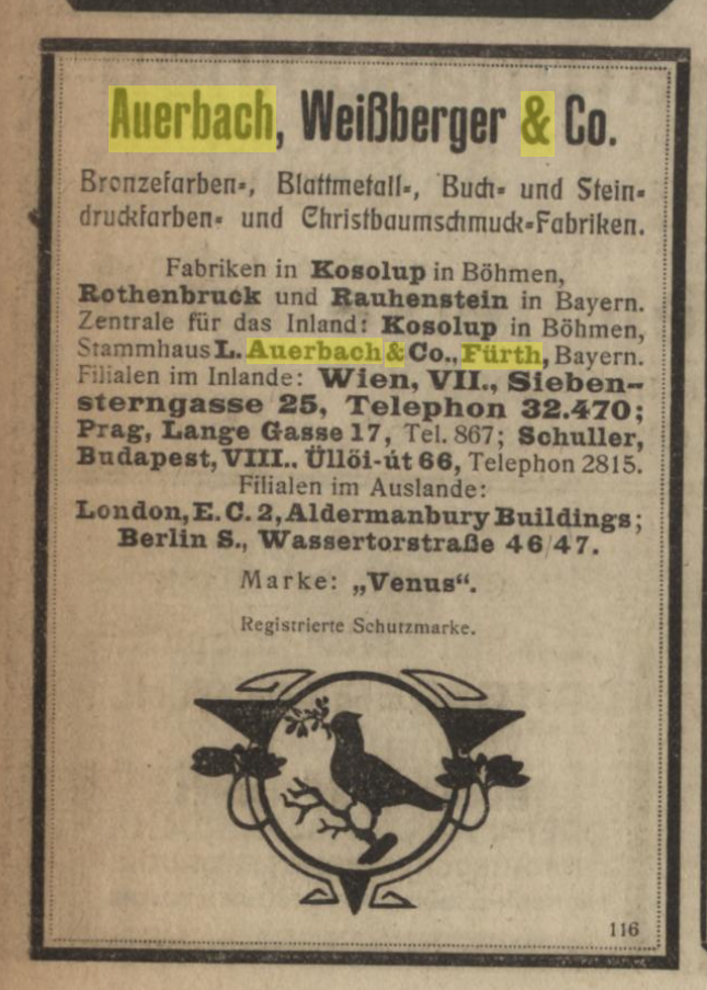 | Dateiinfo (Bild-Unterschrift und Info-Box, automatisch erstellt) | Anzeige Auerbach in "Hof- und Staats-Handbuch der Österreichisch-Ungarischen Monarchie 1918", S. 106 Urheber: Auerbach & Co.<br>Erstellungsdatum: 1918<br>Lizenz: cc-by-sa-3.0 | ||