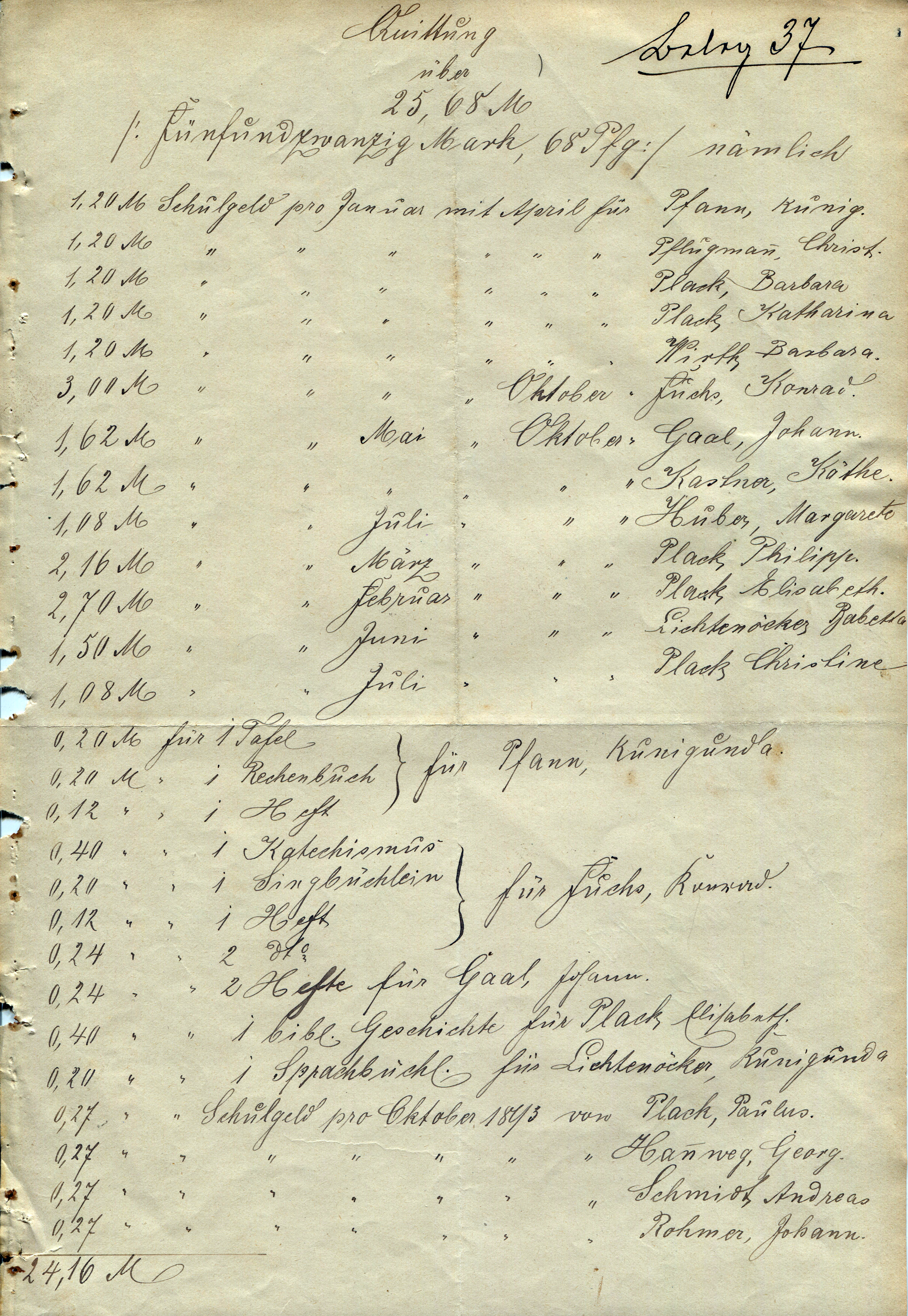 BeschreibungQuittung über Schulgeldzahlungen von Familien (z. B. Plack, Pfann, Wirth, Kastner, Hüber, Lichtenröcker, etc.) in Vach, 1893