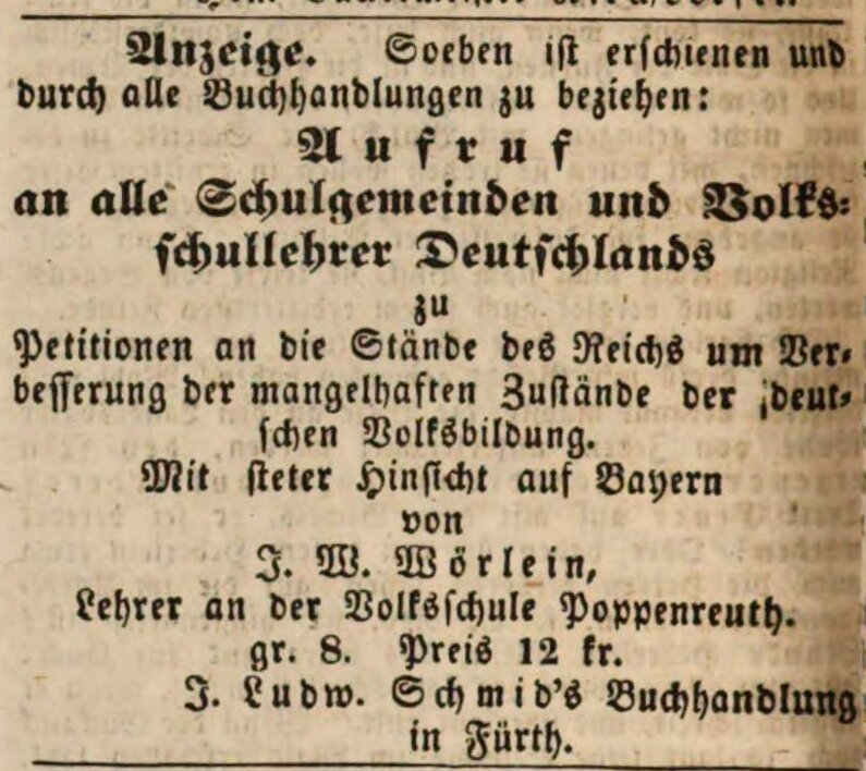 | Beschreibung | Anzeige der Schmid´schen Buchhandlung für Aufruf Wörlein | ||