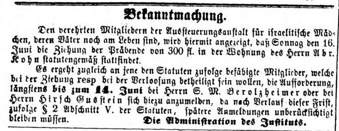 | Einrichtung | Aussteuerungs-Anstalt für israelitische Mädchen | ||