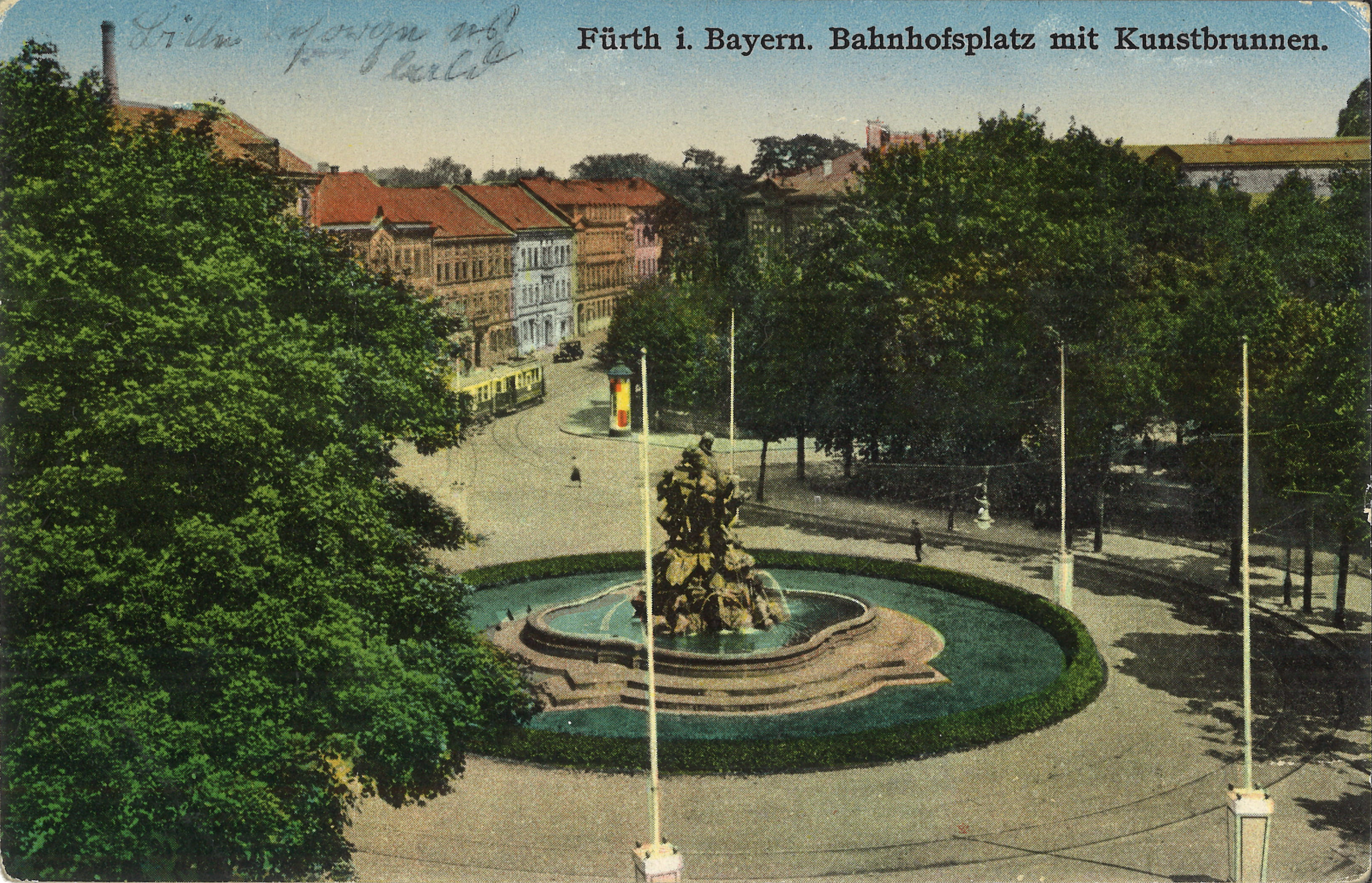 Beschreibung"Bahnhofsplatz mit Kunstbrunnen" (Centaurenbrunnen), colorierte Ansichtskarte, gelaufen 1935
