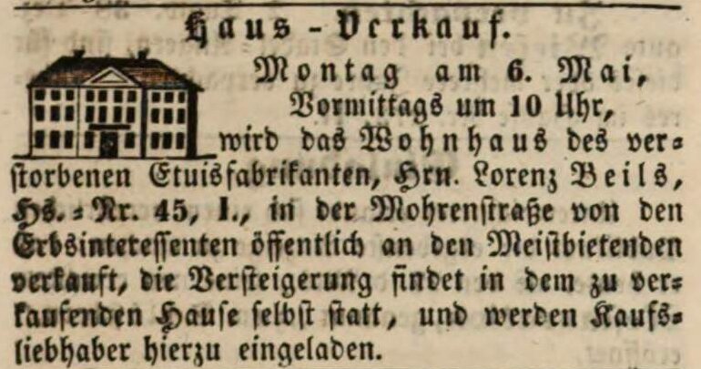 BeschreibungVersteigerungsanzeige für das Haus des verstorbenen Etuisfabrikanten Lorenz Beils, April 1850