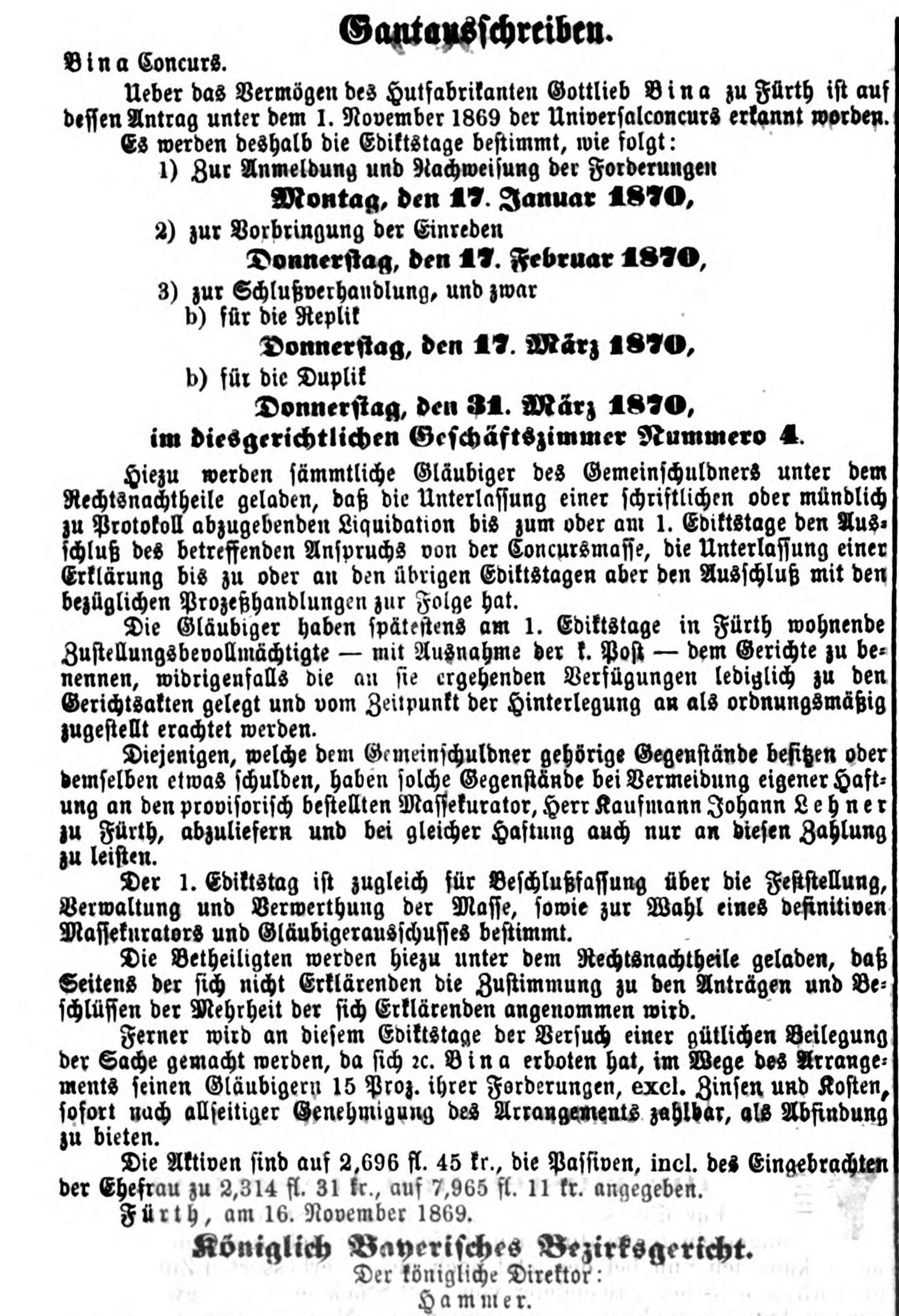 | Beschreibung | Der Hutfabrikant Gottlieb Bina meldet Konkurs an, November 1869 | ||