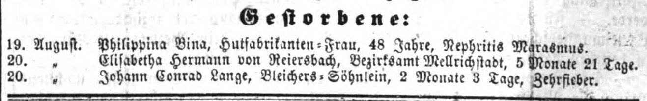 BeschreibungTodesanzeige der Philippina Bina, Hutfabrikanten-Frau, August 1874