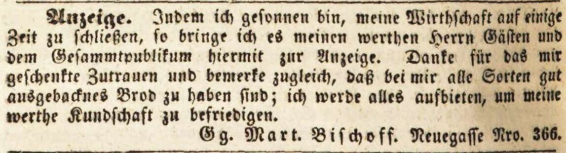 | Beschreibung | Zeitungsanzeige des Wirts und Bäckers Georg Martin Bischoff, Oktober 1841 | ||