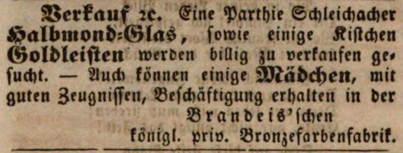 BeschreibungZeitungsanzeige der Brandeis'schen Bronzefarbenfabrik, Dezember 1847