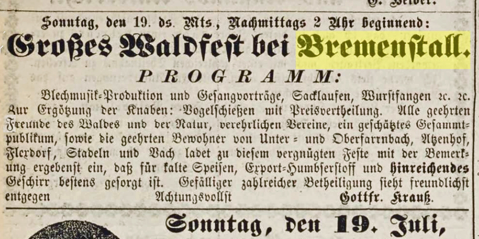| Beschreibung | Zeitungsanzeige im Fürther Tagblatt vom 18. Juli 1874 zu einem Großen Waldfest bei Bremenstall | ||