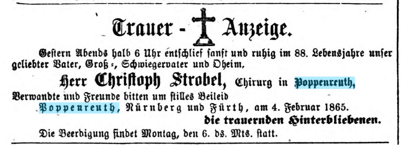 | Beschreibung | Traueranzeige Chirurg Christoph Strobel, Fürther Tagblatt 5.2.1865 | ||