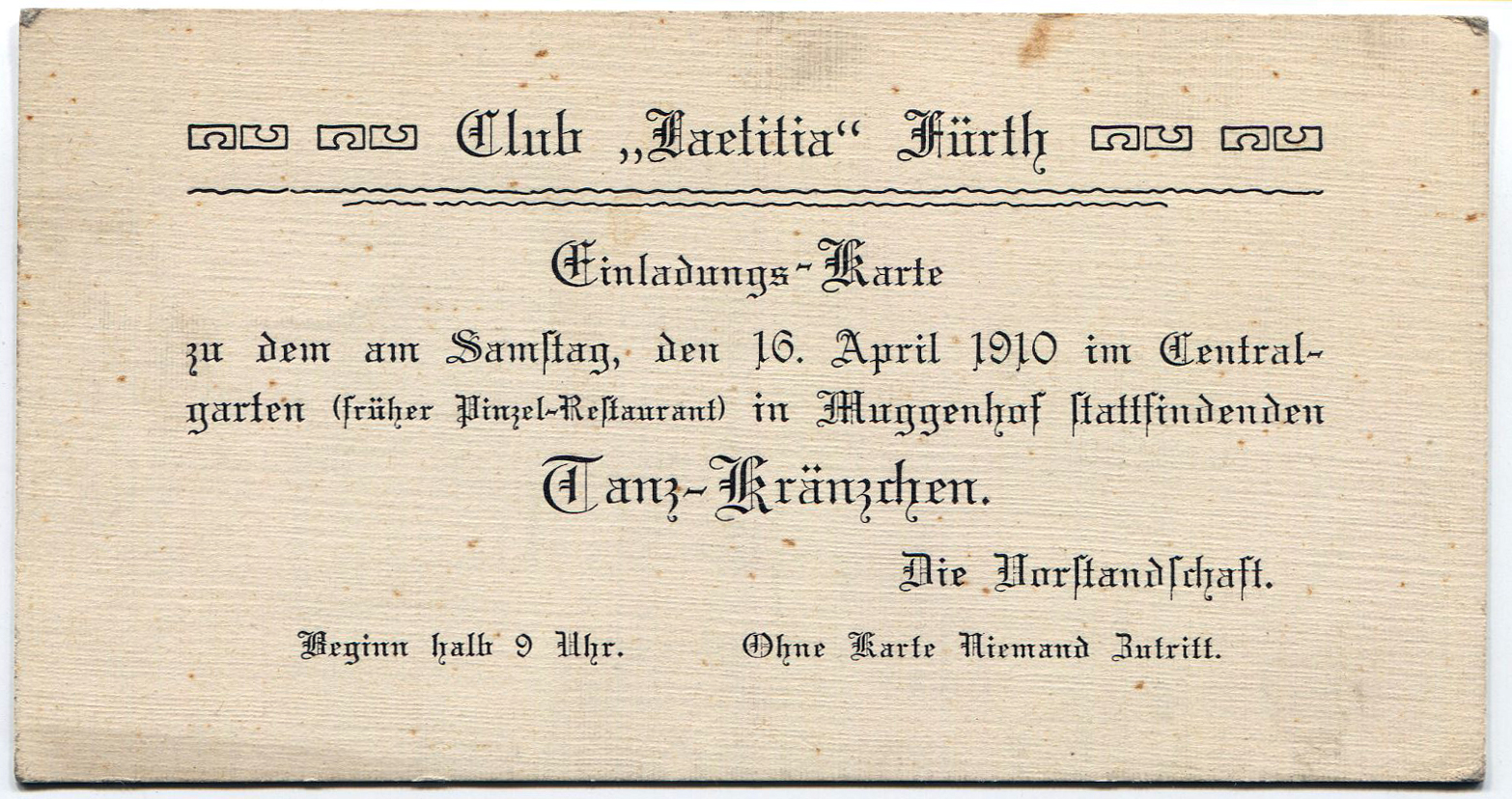 BeschreibungEinladungskarte des Club Laetitia aus Fürth für ein Tanz-Kränzchen in Muggenhof am 16. April 1910
