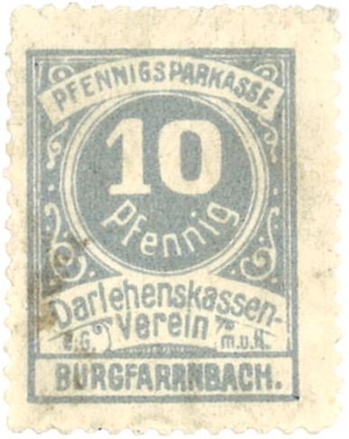 | Beschreibung | Wertmarke über 10 Pfennig des Darlehenskassenverein Burgfarrnbach | ||