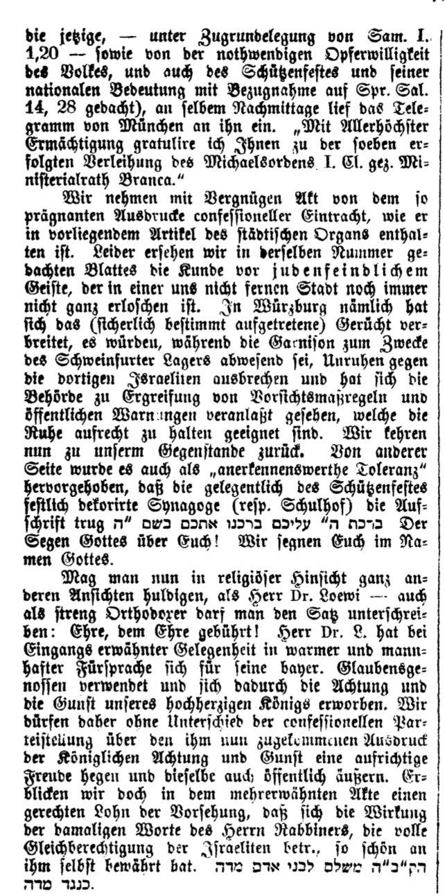 BeschreibungArtikel zur Ehrung Loewis, Der Israelit 16.9.1869 (Fortsetzung)