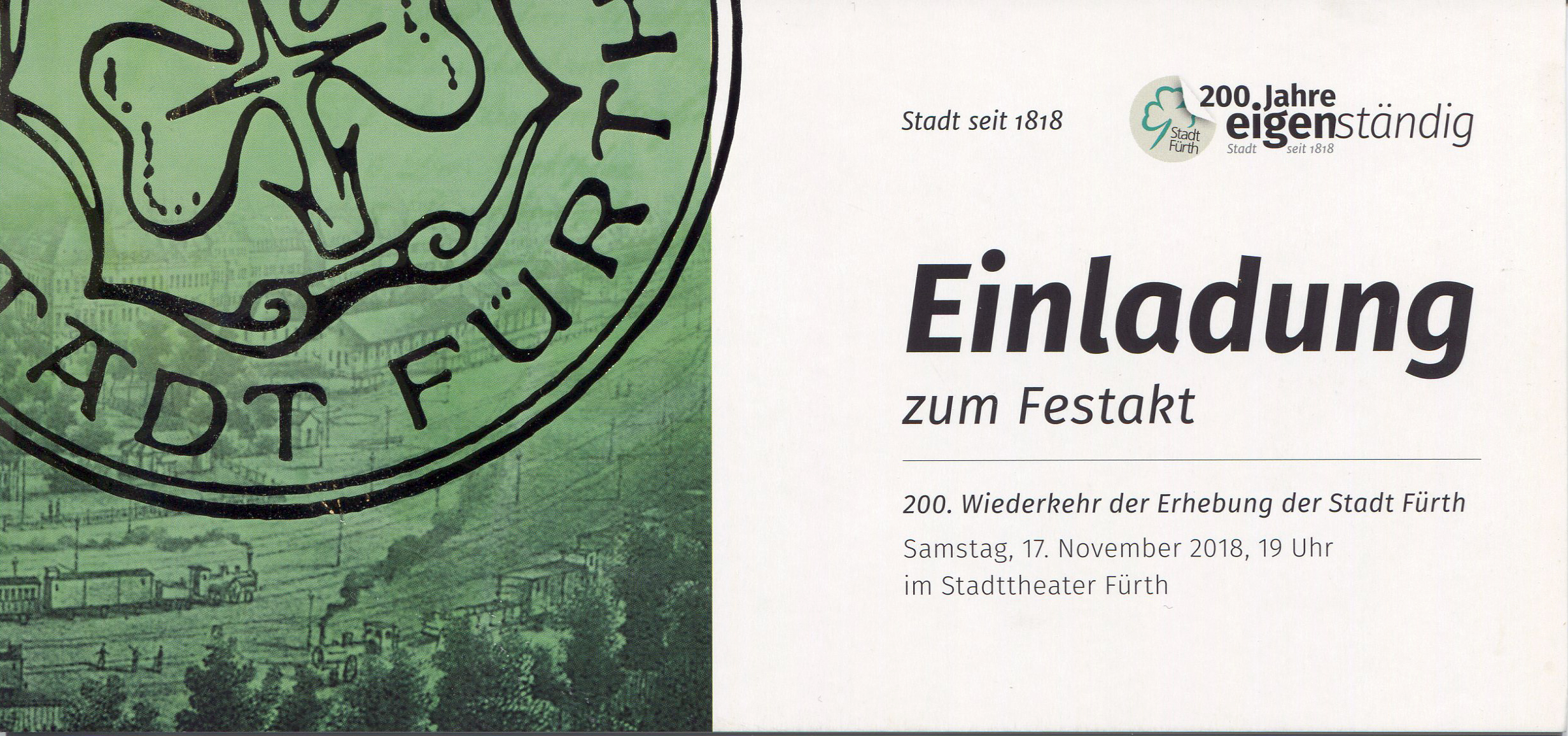 | Beschreibung | Einladung zum Festakt 200. Wiederkehr der Erhebung der Stadt Fürth, 2018 | ||