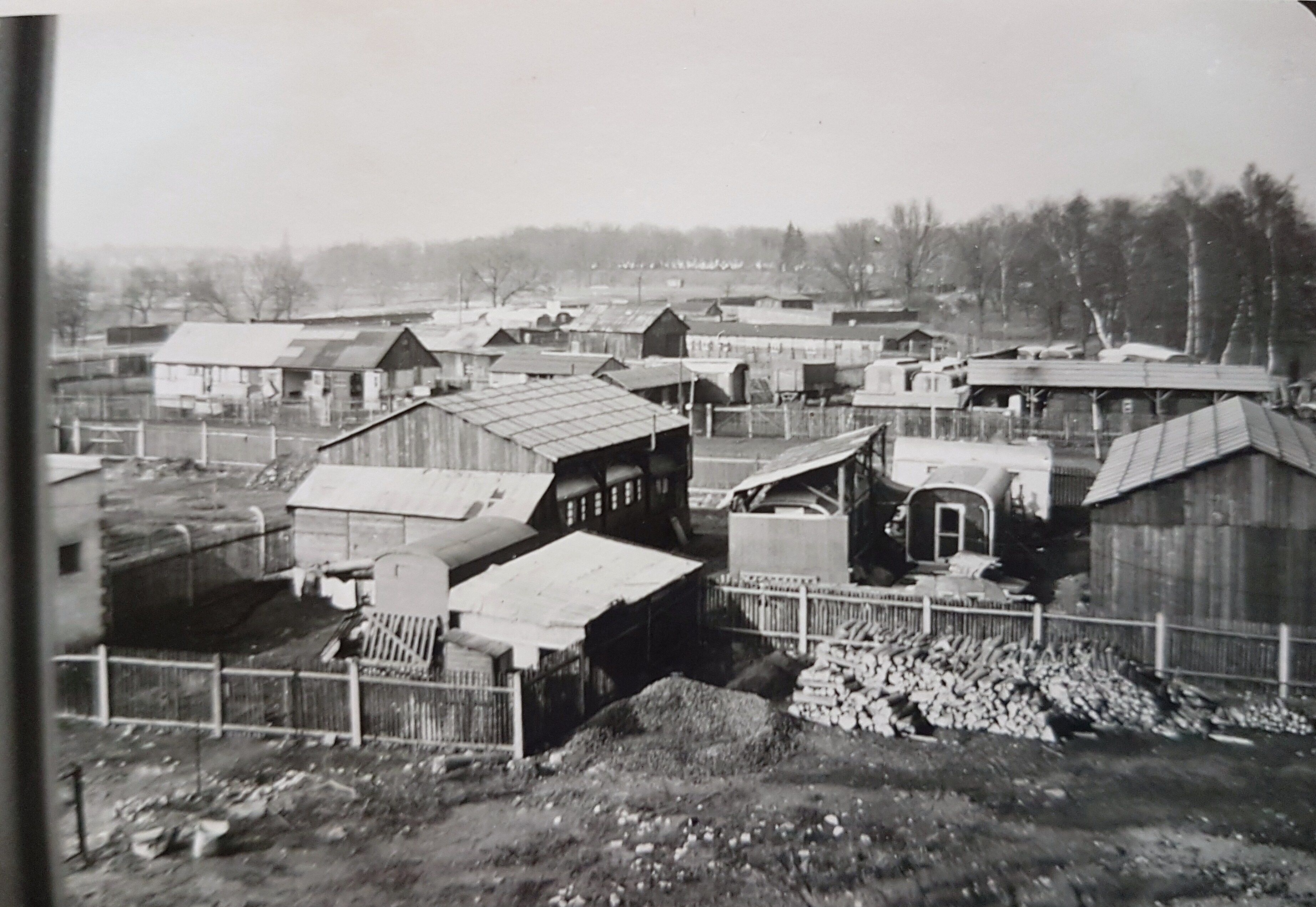 BeschreibungBlick von Erlanger Str. 31 (Rückseite) über Notunterkünfte an der Wolfringstr. in Richtung Friedhof, 1953