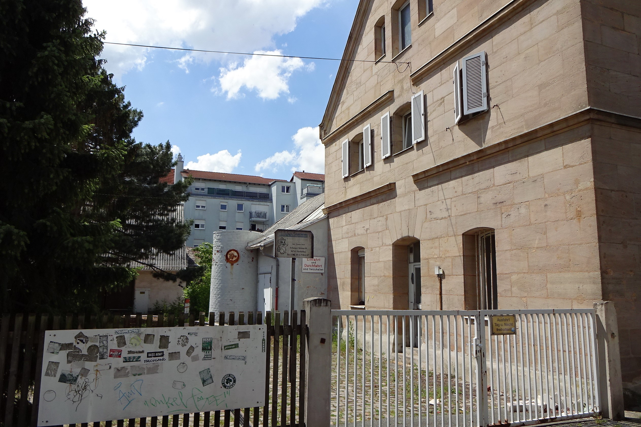 | Beschreibung | Sandsteingebäude der ehemaligen Essigfabrik Erlanger Straße 81/83, Ecke Alte Reutstraße mit Schornsteinstummel am nördlichen Fabrikgebäude, Juni 2020 | ||