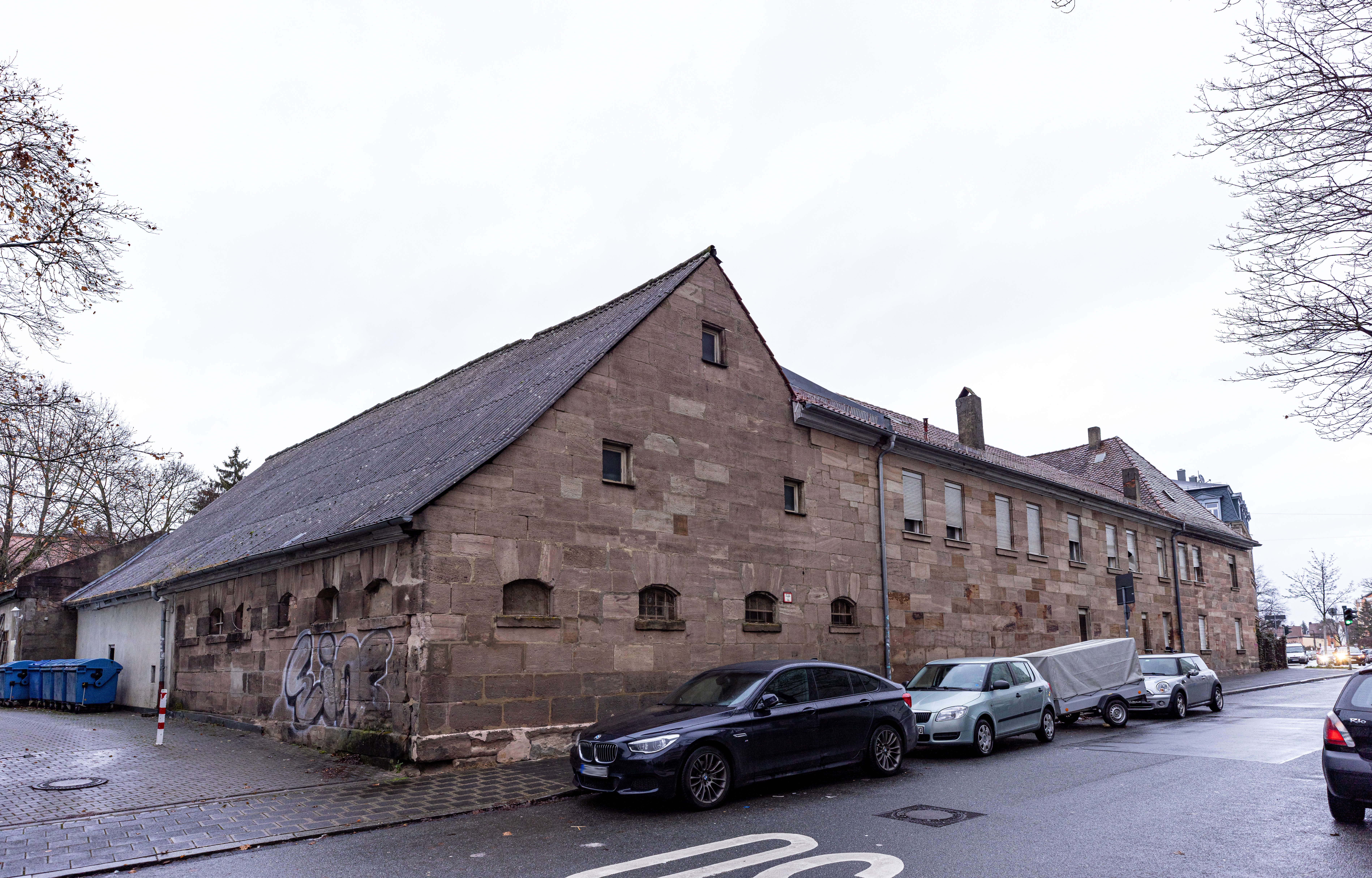 Der 1851 errichtete Ochsenstadel in der Alten Reutstraße, dazwischen der 1860 erbaute Zwischenbau ... Der 1851 errichtete Ochsenstadel in der Alten Reutstraße, dazwischen der 1860 erbaute Zwischenbau für Kutschen und Fahrzeuge, darüber die Wohnungen für das Personal, im Hintergrund das Hauptgebäude aus dem Jahr 1827, Dez. 2021<br>Urheber: Kamran Salimi<br>Erstellungsdatum: 28. Dezember 2021<br>Lizenz: cc-by-sa-3.0