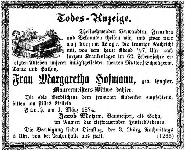 BeschreibungTodesanzeige für Witwe Margaretha Hofmann