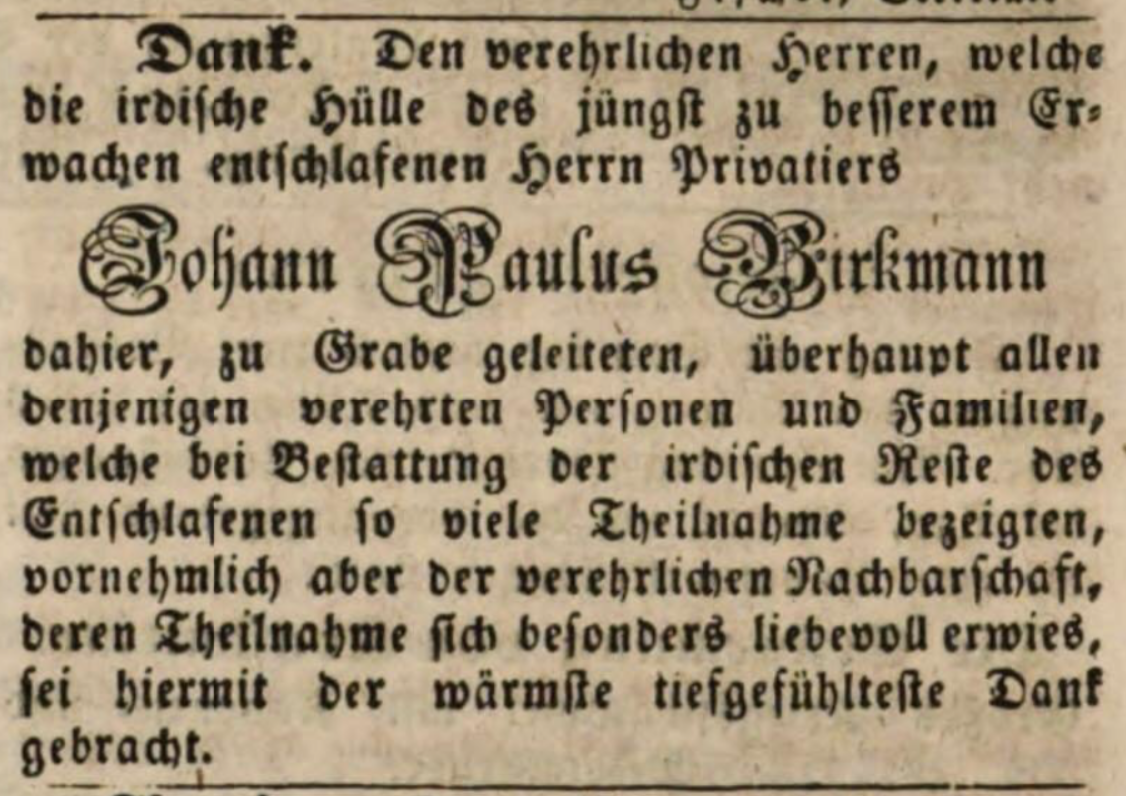 | Beschreibung | Danksagung für die Anteilnahme zu Tod und Begräbnis von Johann Paulus Bürkmann, 6. Okt. 1848 | ||