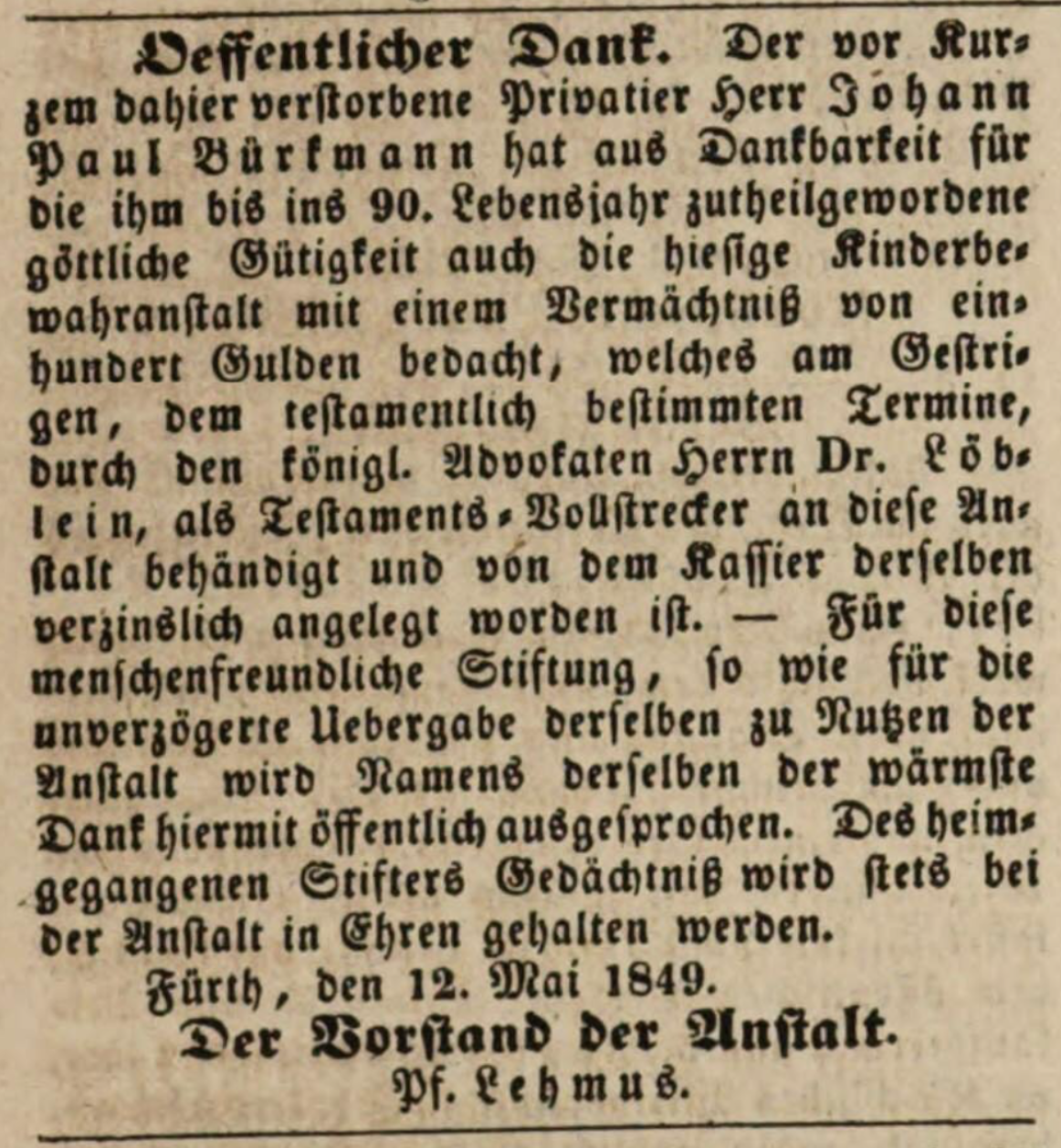 | Quellangaben | Fürther Tagblatt vom 15.05.1849 (Bayerische Staatsbibliothek) | ||
