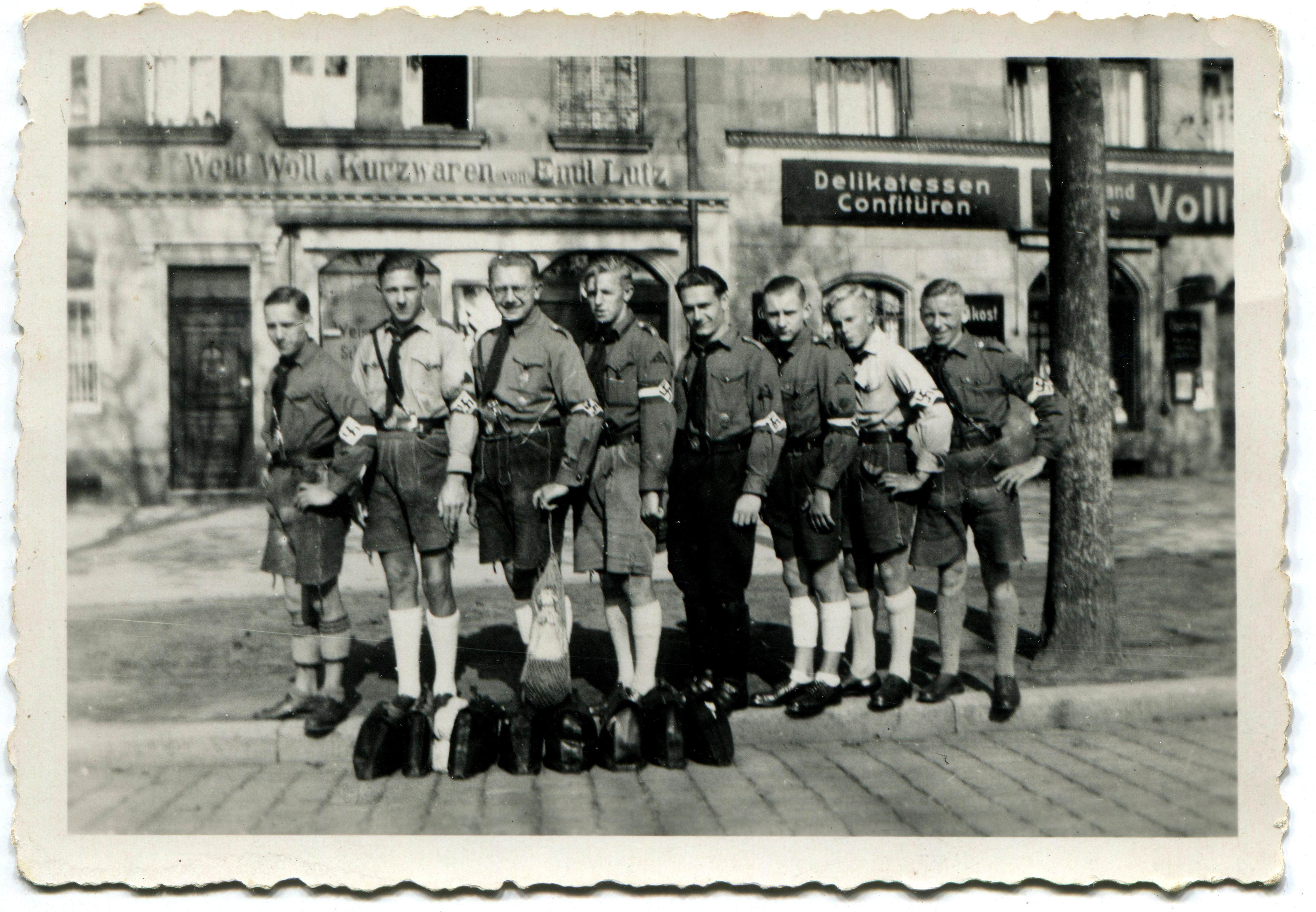 BeschreibungEine Gruppe von Jungen, auf der Rückseite ist vermerkt, dass es sich um eine Gruppe der Fürther Hitler Jugend (HJ) handelt, datiert 1934