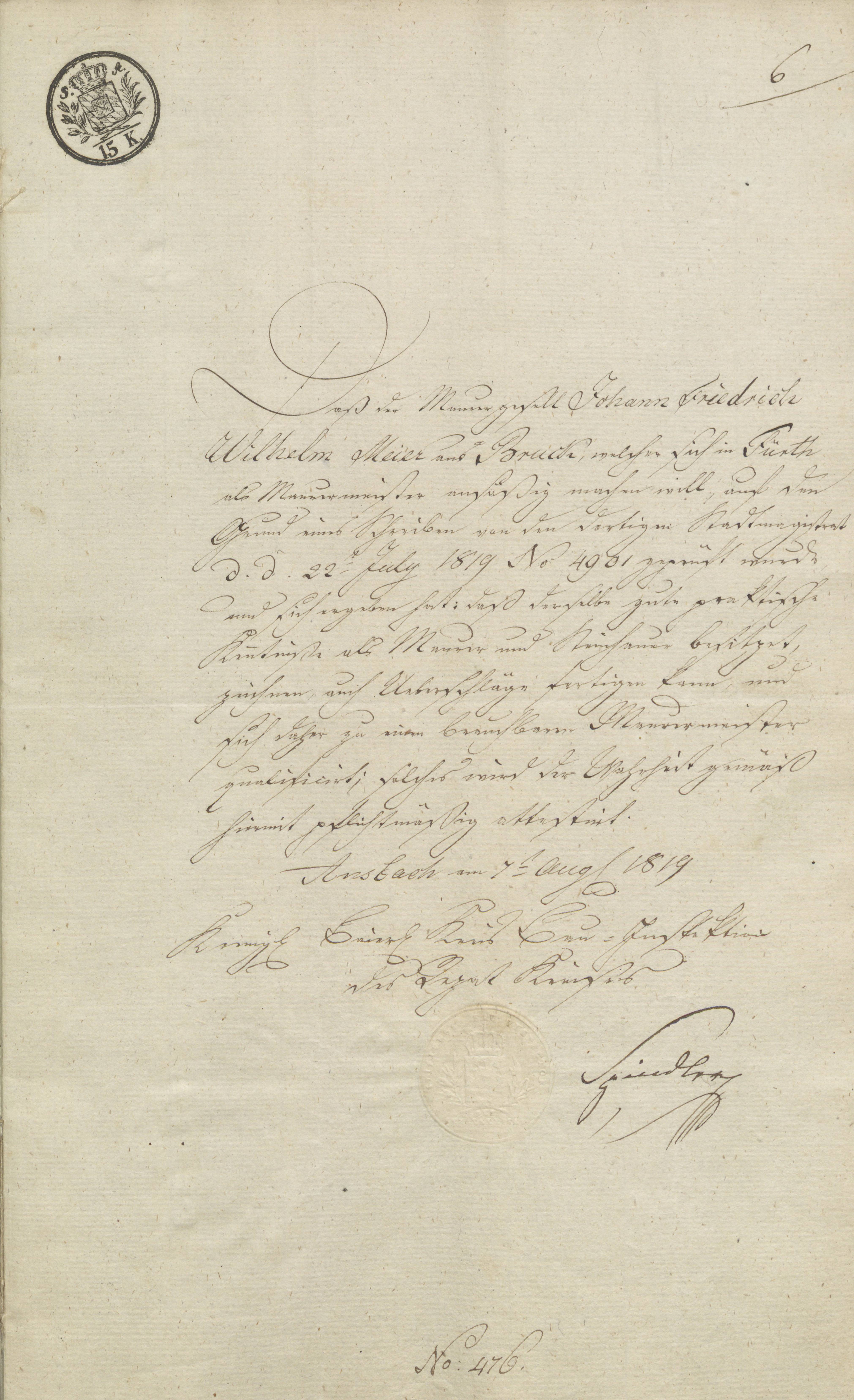 | Beschreibung | Prüfzeugnis der k. Kreisbauinspektion vom 7. August 1819 für W. Meyer | ||