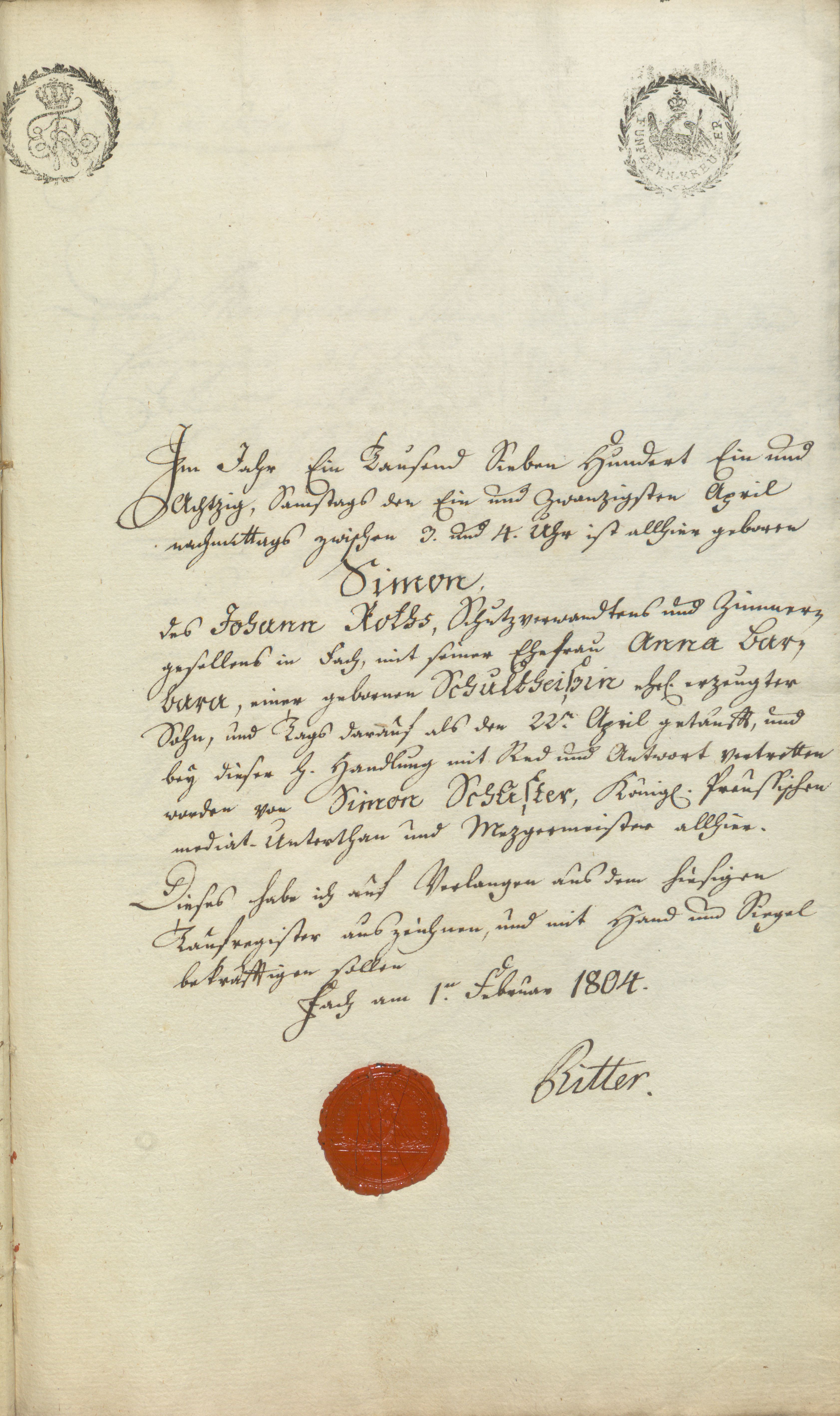 Taufschein für Simon Roth, ausgestellt vom Vacher Pfr. Joh. Christ. Ritter Erstellungsdatum: 1. Februar 1804<br>Lizenz: Bildlizenz-Stadtarchiv