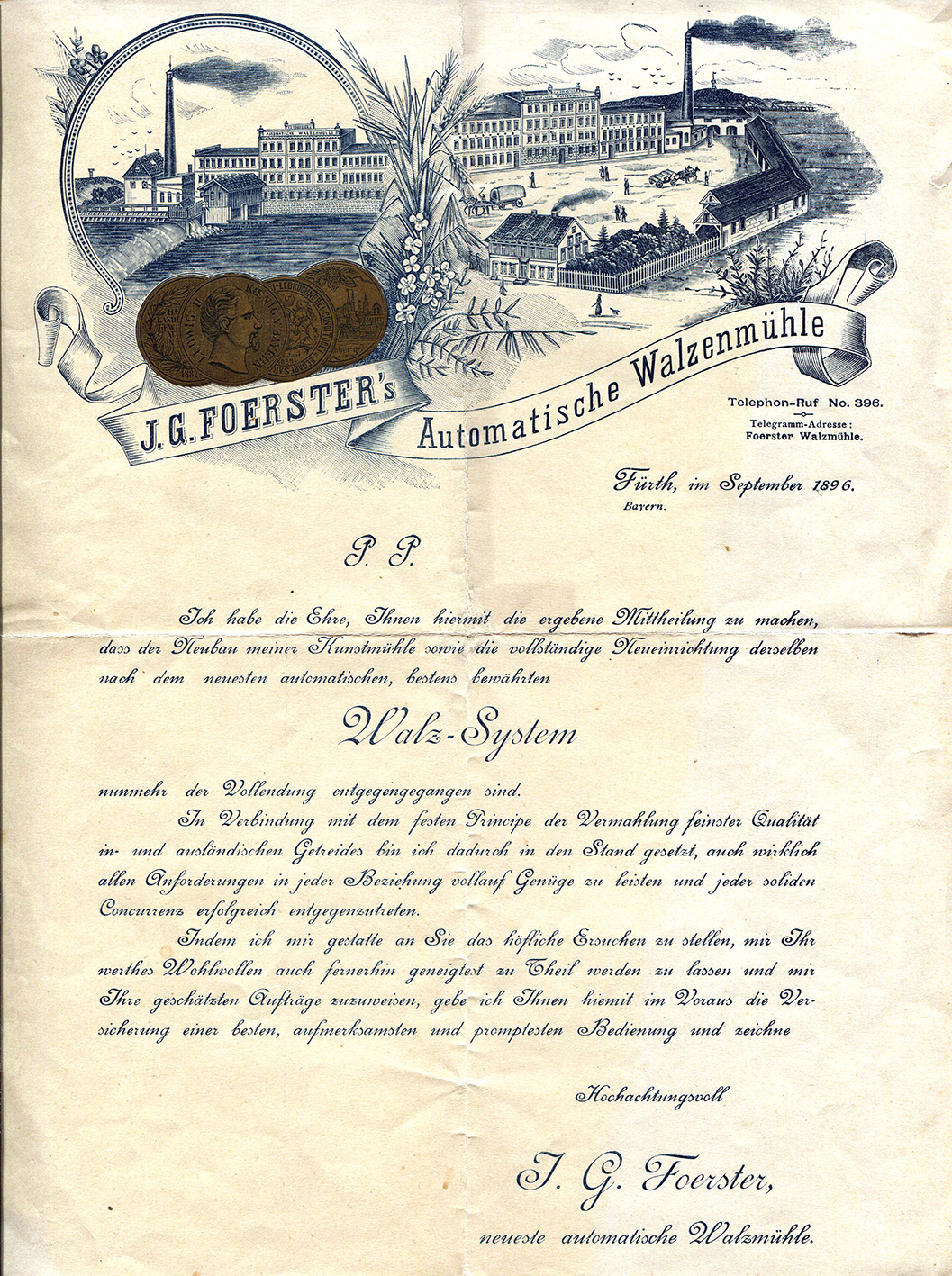 BeschreibungSchreiben der Firma J. G. Foerster (Foerstermühle) aus dem Jahr 1896