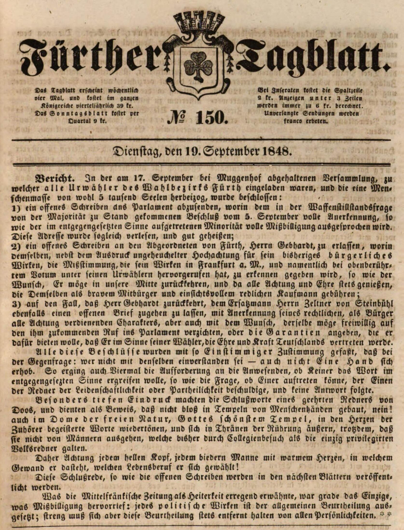 | Beschreibung | Fürther Urwähler gegen Waffenstillstand, Fürther Tagblatt 19.9.1848 | ||