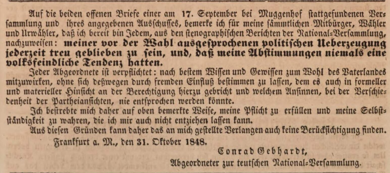 BeschreibungZeitungsanzeige von des Abgeordneten Conrad Gebhardt, Herbst 1848