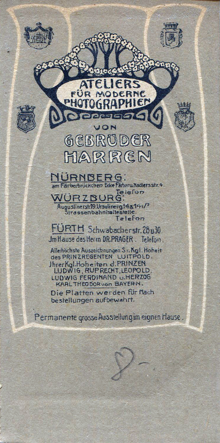 | Beschreibung | Fotokartenrückseite mit einer Dame mit Hut aus dem Photoatelier Gebr. Harren in der Schwabacher Straße 28/30 - im Hause des Dr. Prager, ca. 1910 | ||