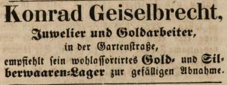 | Beschreibung | Zeitungsannonce des Juweliers Konrad Geiselbrecht, Dezember 1848 | ||