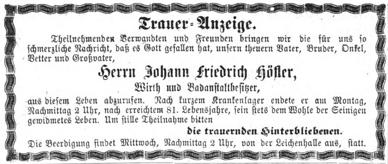 | Beschreibung | Traueranzeige für den "Wirth und Badeanstaltbesitzer" Johann Friedrich Höfler, November 1867 | ||