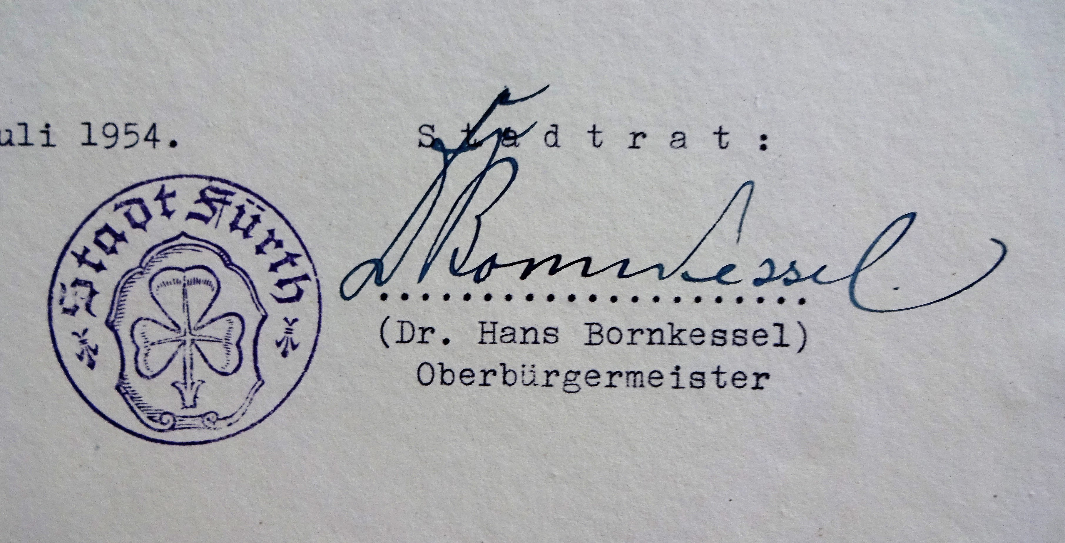 Unterschrift von OB Hans Bornkessel und Dienstsiegel vom 29.7.1954 Urheber: Stadt Fürth<br><br>Lizenz: cc-by-sa-3.0