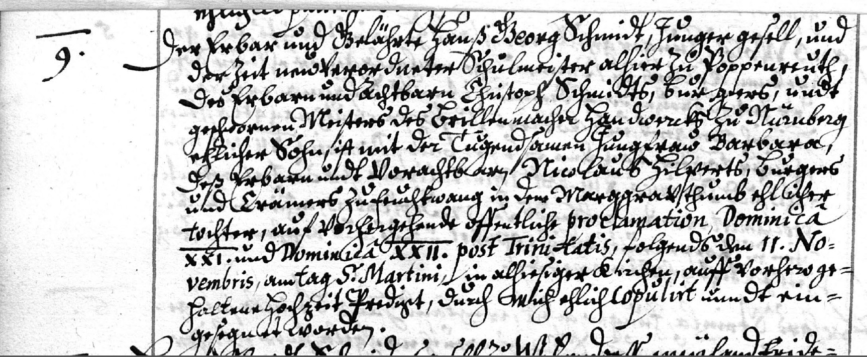 BeschreibungPoppenreuther Kirchbucheintrag vom 11.11.1667 laut dem der Schulmeister Hans Georg Schmidt die Barbara Hilpert ehelichte