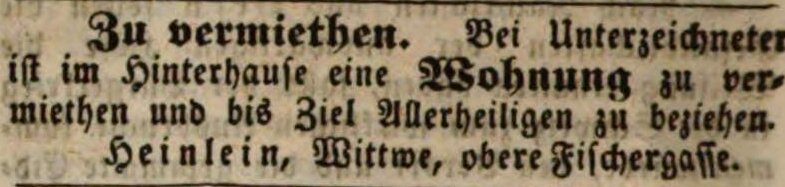 | Beschreibung | Zeitungsanzeige der Witwe von Georg Martin Heinlein in der oberen Fischergasse, Oktober 1847 | ||