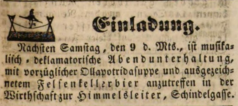 | Beschreibung | Werbeannonce für die Wirtschaft zur Himmelsleiter, November 1850 | ||