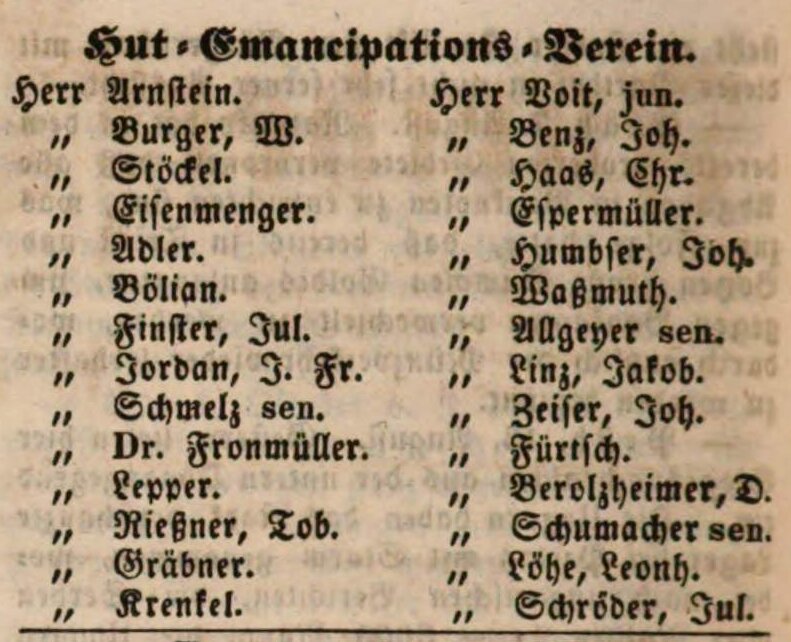 | Beschreibung | Mitglieder des Hut Emancipations-Verein, Fürther Tagblatt 23. August 1848 | ||