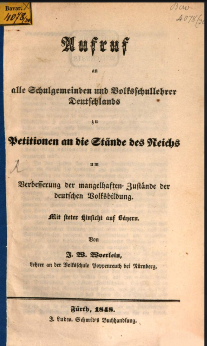 | Dateiinfo (Bild-Unterschrift und Info-Box, automatisch erstellt) | J. W. Wörlein, Aufruf an alle Schulgemeinden und Volksschullehrer Deutschlands Erstellungsdatum: 1848<br>Lizenz: cc-by-sa-3.0 | ||