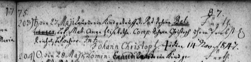 | Beschreibung | Eintrag Johann Christoph Balbierer Taufbuch 1775, Kirche St. Michael | ||
