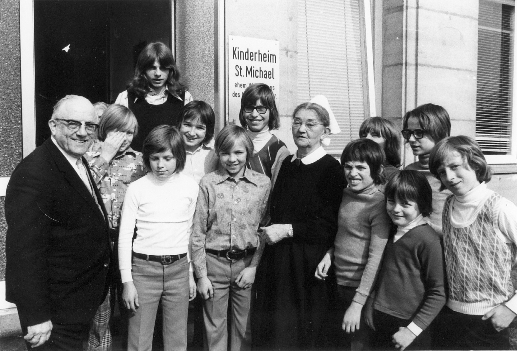 BeschreibungKR Karl Will und Schwester Marie mit Kindern vor Kinderheim St. Michael, ca. 1965