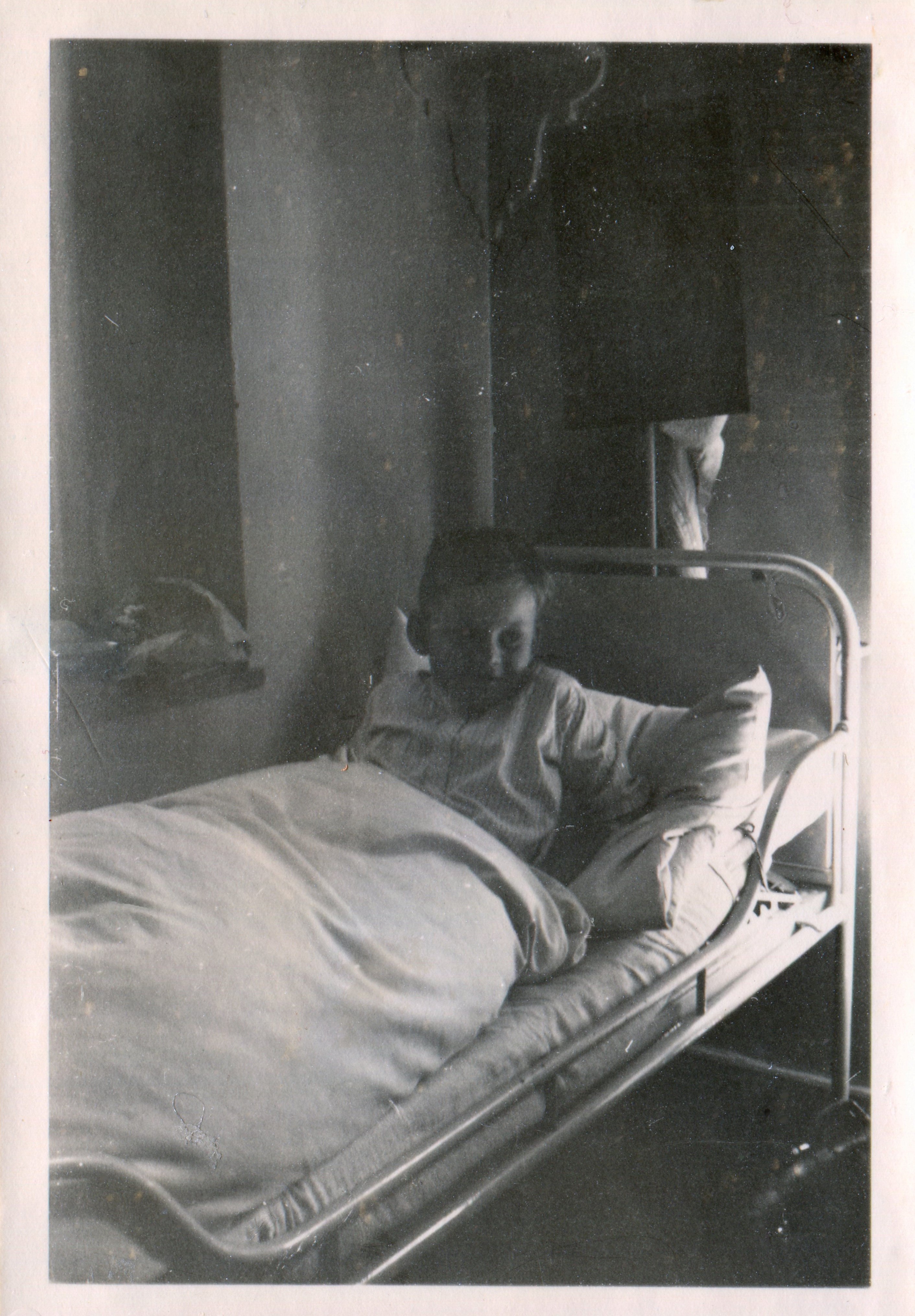 BeschreibungPatient Norbert Pietsch 1956 im Kinderspital im 1. Stock. Glasfenster links ist Abtrennung zu der Mädchen Abteilung (rechter Anbau mit den 2 großen Fenstern straßenseitig). Auf der Postkarten Abbildung 1942 gleicher und größerer Blickwinkel der Raumsituation dazu.